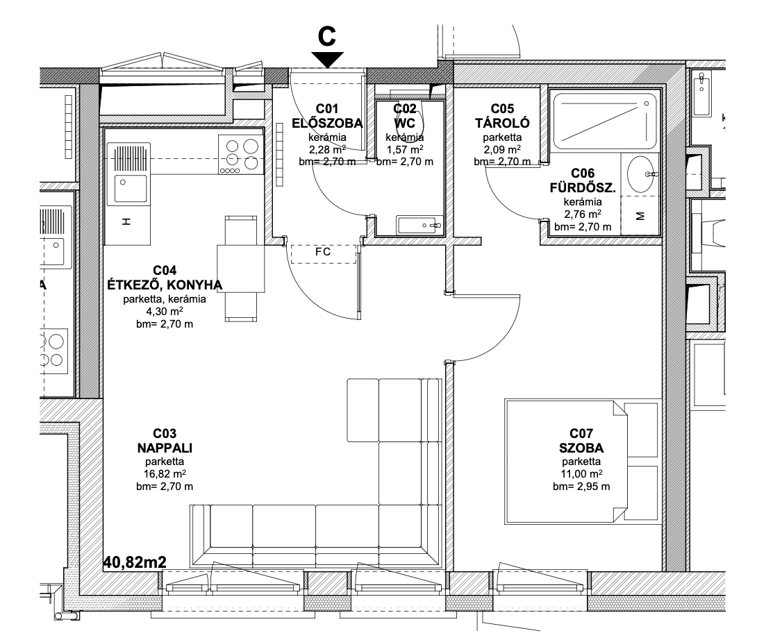 Ez a lakás a 41 négyzetméter alapterületével kompakt, mégis otthonos. A nappali központi tere és a külön nyíló hálószoba ideális megoldás kisebb háztartások számára.